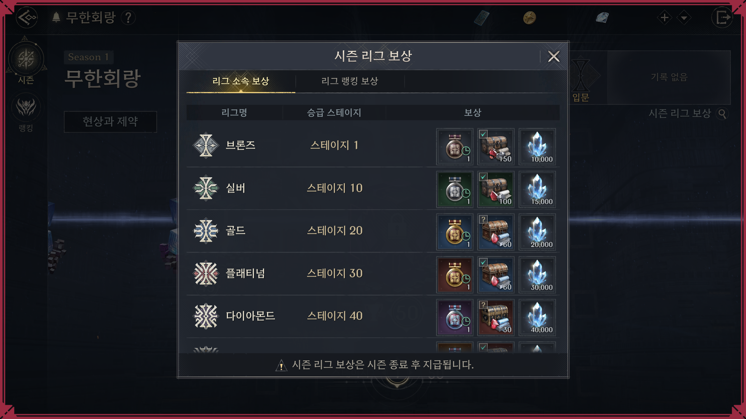 · 리그 소속 보상: 시즌 동안 도달한 가장 높은 '리그'에 따라 지급되는 보상입니다.