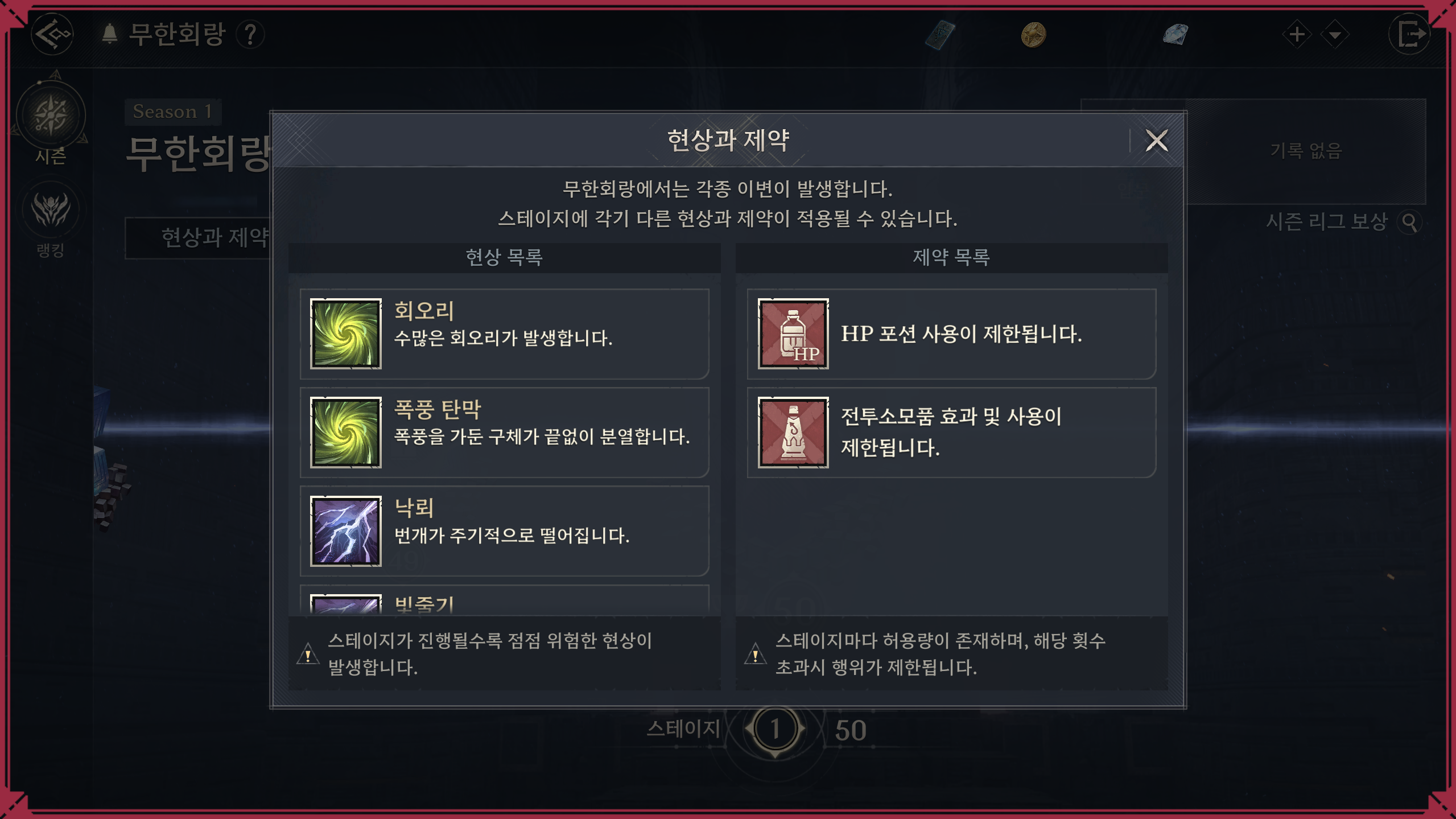 무한회랑의 도전이 언제나 새로운 이유, 바로 시즌 및 스테이지마다 변화하는 특수한 ‘이벤트 설정’ 때문입니다. 각 스테이지에는 ‘현상’과 '제약'이라는 두 가지 특수 규칙이 적용되어, 단순한 전투력 싸움이 아닌 전략적인 대응과 컨트롤을 요구합니다.