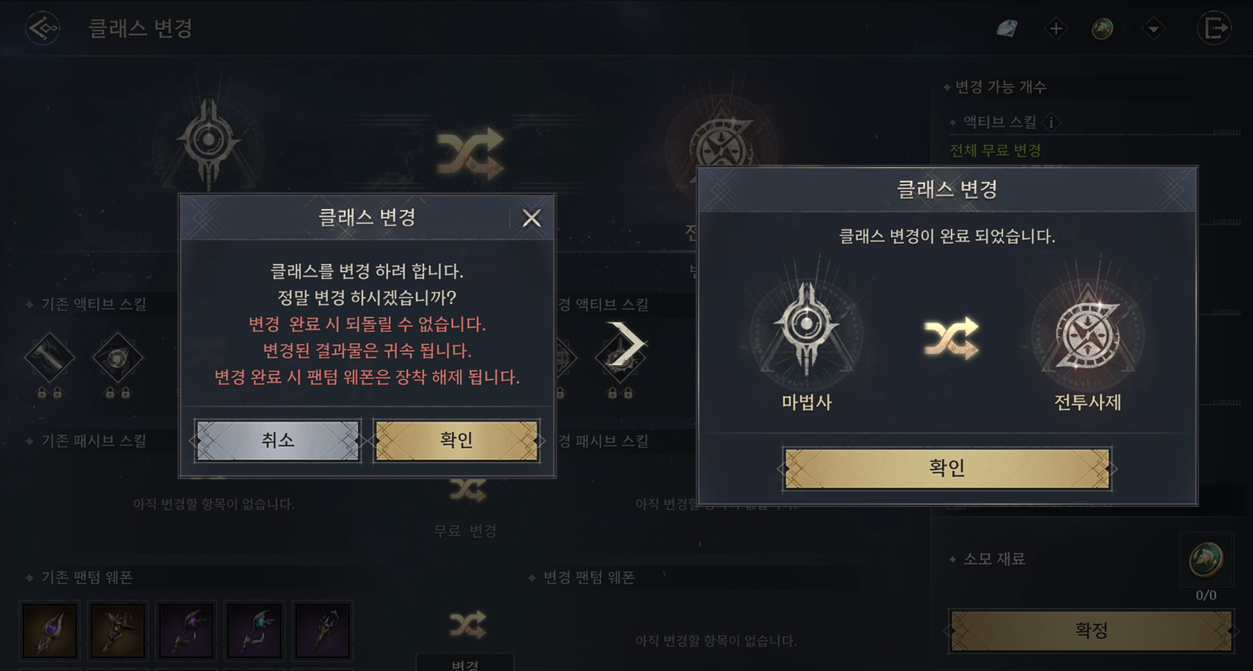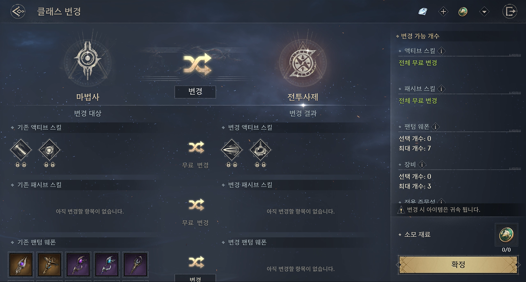 - 클래스 변경과 함께 선택한 장비 및 전용 주문석은 현재 귀속 상태와 무관하게 변경 완료 시 '귀속' 상태로 변경/유지됩니다.